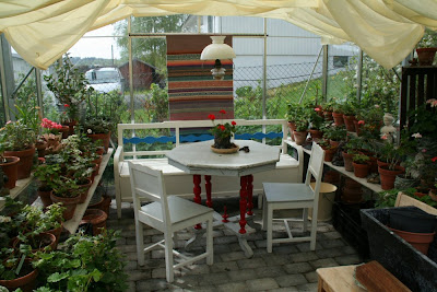 Det blev så jättefint... men när den kom in i växthuset blev jag inte nöjd med plast/trä-möbel-blandningen!!!